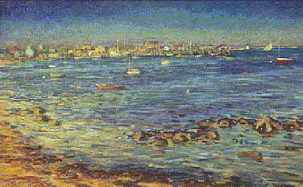 The two oil paintings below were inspired by morning sun on the town of Nantucket as seen from Monomoy. The one at the left is 8 X 10 inches. The one on the right is 2 X 3 feet in size.